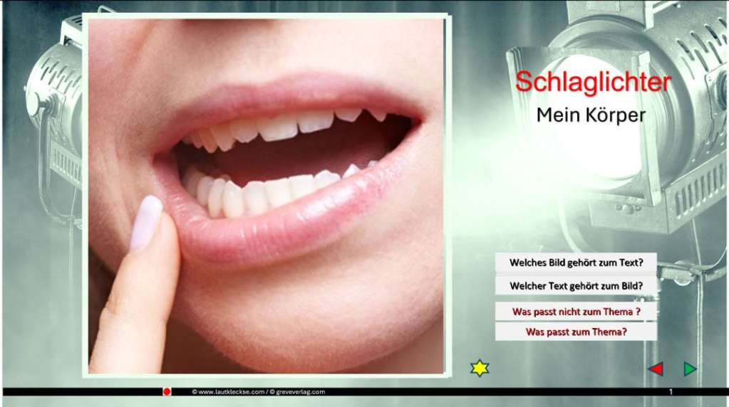 Die App beinhaltet 80 Fragen zum Thema "Körper" die sich auf die vier, grundsätzlichen Fragestellungen verteilen 1) Welche Abbildung passt zum Text?, 2) Welcher Text passt zur Abbildung?, 3) Welche Abbildung passt zum Thema? und 4) Welche Abbildung passt nicht zum Thema? Der Schwierigkeitsgrad fällt bei 3) und 4) deutlich ab, so daß die Aufgabenstellungen innerhalb der Therapiesitzung sehr gut auf die Leistungsfähigkeit der Patienten angepaßt werden können