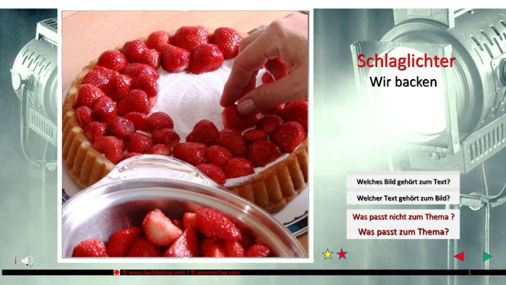 Die App beinhaltet 80 Fragen zum Thema "Backen" die sich auf die vier, grundsätzlichen Fragestellungen verteilen 1) Welche Abbildung passt zum Text?, 2) Welcher Text passt zur Abbildung?, 3) Welche Abbildung passt zum Thema? und 4) Welche Abbildung passt nicht zum Thema? Der Schwierigkeitsgrad fällt bei 3) und 4) deutlich ab, so daß die Aufgabenstellungen innerhalb der Therapiesitzung sehr gut auf die Leistungsfähigkeit der Patienten angepaßt werden können.