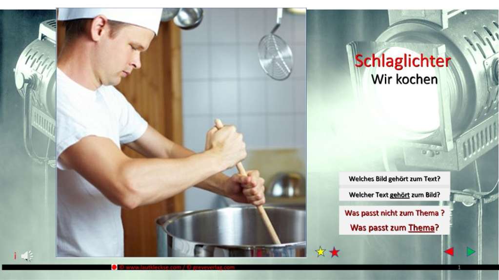 Die App beinhaltet 80 Fragen zum Thema "Kochen" die sich auf die vier, grundsätzlichen Fragestellungen verteilen 1) Welche Abbildung passt zum Text?, 2) Welcher Text passt zur Abbildung?, 3) Welche Abbildung passt zum Thema? und 4) Welche Abbildung passt nicht zum Thema? Der Schwierigkeitsgrad fällt bei 3) und 4) deutlich ab, so daß die Aufgabenstellungen innerhalb der Therapiesitzung sehr gut auf die Leistungsfähigkeit der Patienten angepaßt werden können.