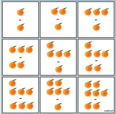 ... beinhaltet 6 Legeplattformen mit jeweils 9 Fragestellungen in Form von Früchten und Ziffern im Zahlenbereich von 1 bis 10 sowie 18 Antwortkarten in Form von Ziffern und 18 Antwortkarten in Form von Bildern. Das Spiel vermittelt anhand der in Form von Orangen dargestellten Zahlenwerte zwischen 1und 10 die Auswirkungen, die durch das unterschiedliche Wegnehmen einer unterschiedlichen Menge an Orangen und der symbolischen Darstellung in Form von Ziffern, entstehen.